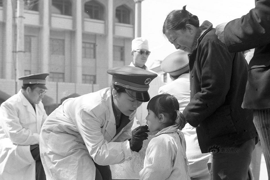 ▲1986年5月,新疆軍區醫務人員在給烏魯木齊市兒童喂服小兒麻痹糖丸疫苗。上世紀60年代開始,脊灰減毒活疫苗(糖丸)在我國廣泛推廣使用,在阻止脊灰流行方面起到非常大的作用