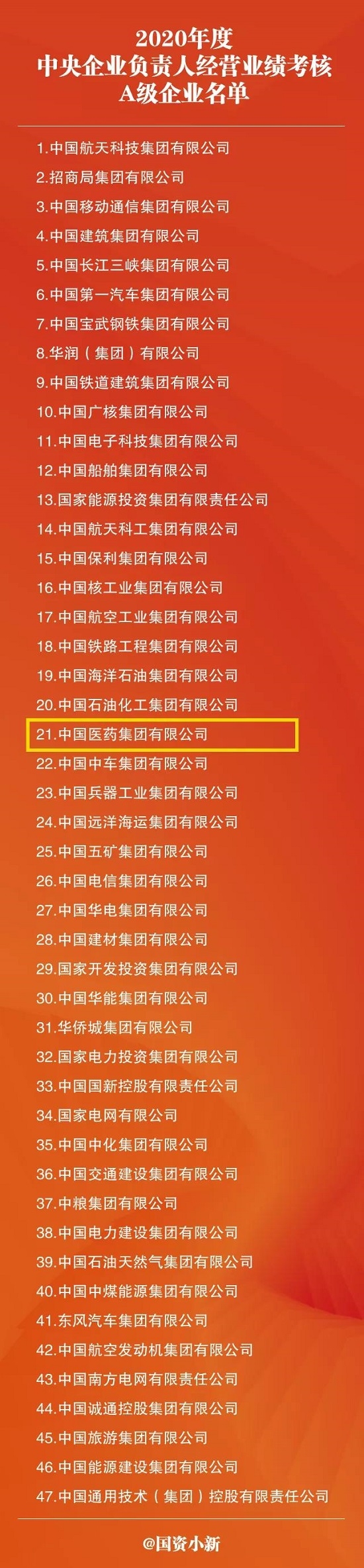 7月13日,國資委發布2020年度中央企業負責人經營業績考核結果,國藥集團連續7年進入中央企業負責人經營業績考核A級企業名單。