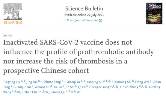 近日,國際權威自然科學綜合性學術刊物Science Bulletin(科學通報,影響因子IF:11.780),發表上海交通大學醫學院附屬瑞金醫院呼吸與危重癥醫學科主任、呼吸病研究所所長、上海市呼吸傳染病應急防控與診治重點實驗室主任瞿介明教授團隊開展的一項旨在探索新冠滅活疫苗是否會促進血栓相關自身抗體的產生及是否會增加接種后血栓事件風險的前瞻性研究成果。