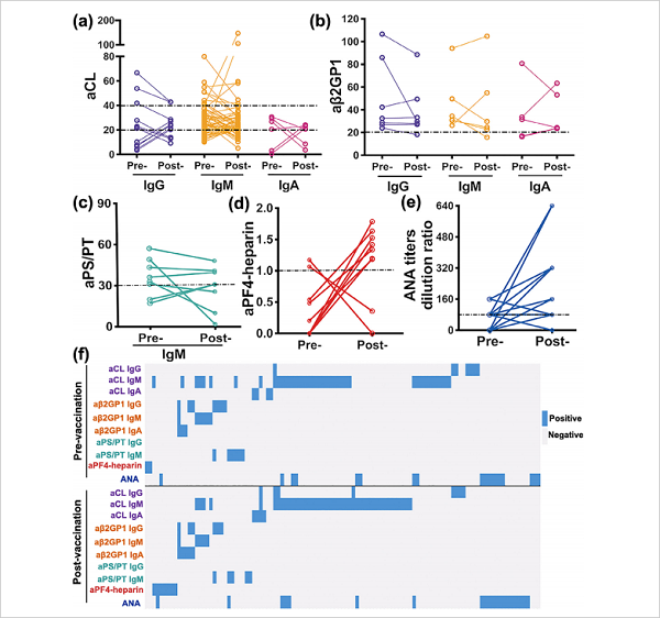 結果顯示:第1劑新冠滅活疫苗接種前,入組者新冠抗體陽性率為0,第二劑疫苗接種4周后,新冠抗體血清轉化率為95.81% (389/406)。自身抗體的陽性率及抗體水平在接種前后采集的樣本中沒有顯著差異。在最少8周的隨訪期內,所有入組者均未出現血栓事件及血小板減少。因此,新型冠狀病毒滅活疫苗未影響抗磷脂抗體和抗PF4-肝素抗體的水平,同時不增加血栓形成的風險。