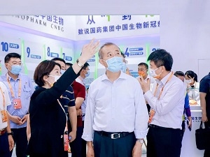中共中央政治局委員、北京市委書記蔡奇蒞臨國藥集團中國生物展臺,國藥集團黨委書記、董事長劉敬楨、國藥集團中國生物黨委書記朱京津介紹國藥集團科技抗疫重要成果