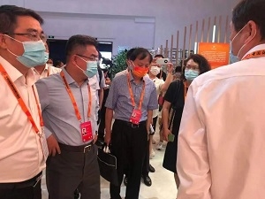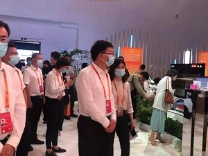 9月2日晚,峰會開始前,韓正和胡春華、蔡奇等領導同志視察服貿會展館。國藥集團黨委書記、董事長劉敬楨(下圖左1)作為參展企業負責人向中央領導同志進行專題匯報,并且作為唯一企業代表,全程陪同中央領導同志巡館。