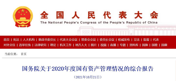 10月25日,中國人大網發布《國務院關于2020年度國有資產管理情況的綜合報告》。報告是根據《中共中央關于建立國務院向全國人大常委會報告國有資產管理情況制度的意見》、《全國人民代表大會常務委員會關于加強國有資產管理情況監督的決定》要求形成的。10月21日,十三屆全國人大常委會第三十一次會議審議了國務院關于2020年度國有資產管理情況的綜合報告,亮出我國國有資產管理最新“賬本”。