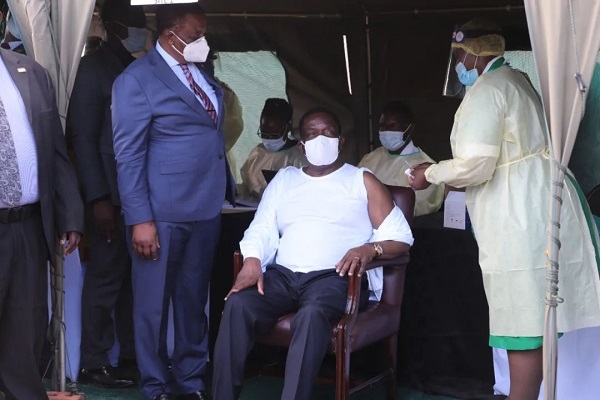 2021年3月24日,津巴布韋總統姆南加古瓦(中)在維多利亞瀑布城準備接種新冠疫苗。新華社發(陳雅琴 攝)
