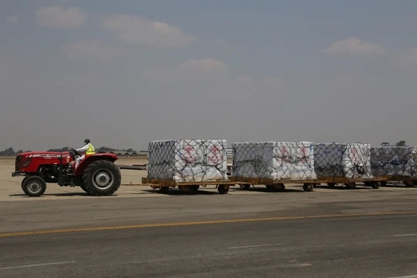 2021年9月26日,工作人員在津巴布韋首都哈拉雷的羅伯特·穆加貝國際機場轉運中國援助的新冠疫苗。當天下午,中國援助津巴布韋的第四批新冠疫苗運抵首都哈拉雷。新華社發(陳雅琴 攝)