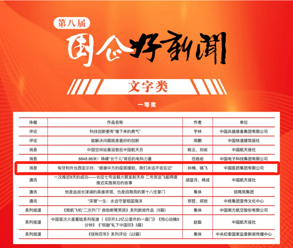 由國藥集團報送的《匈牙利外長西亞爾托:“感謝中方的疫苗援助,我們永遠不會忘記”》榮膺第八屆“國企好新聞”文字類一等獎。