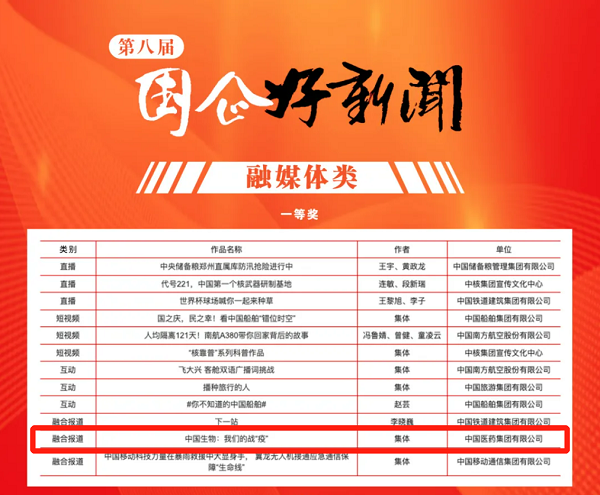由國藥集團報送的《中國生物:我們的戰(zhàn)“疫”》榮膺第八屆“國企好新聞”融媒體類一等獎。