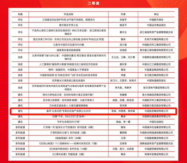 在全部3772件申報作品中,227件精品榮膺“國企好新聞”。其中,在32件一等獎作品中,國藥集團榮膺2個一等獎,在66件二等獎作品中,國藥集團榮膺1個二等獎,斬獲歷史最好成績。