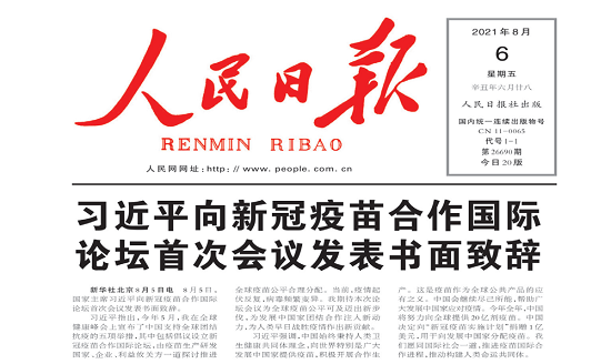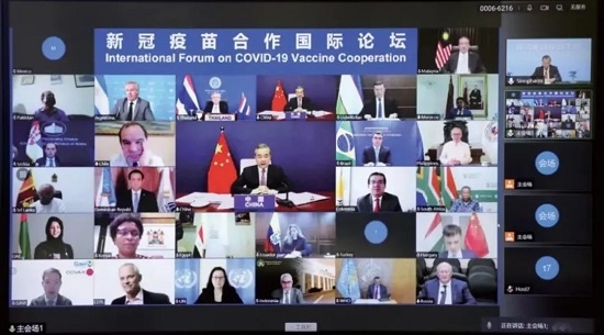 2021年5月,習近平主席在全球健康峰會上宣布了中國支持全球團結抗疫的五項舉措,其中包括倡議設立新冠疫苗合作國際論壇,由疫苗生產研發國家、企業、利益攸關方一道探討推進全球疫苗公平合理分配。2021年8月5日,新冠疫苗合作國際論壇首次會議以視頻方式舉行。國家主席習近平向會議發表書面致辭,國務委員兼外長王毅主持會議。聯合國秘書長古特雷斯、世界衛生組織總干事譚德塞、全球疫苗免疫聯盟首席執行官伯克利、有關國家領導人及外交部長、衛生部長等政府高級官員、聯合國及有關國際組織代表出席論壇。