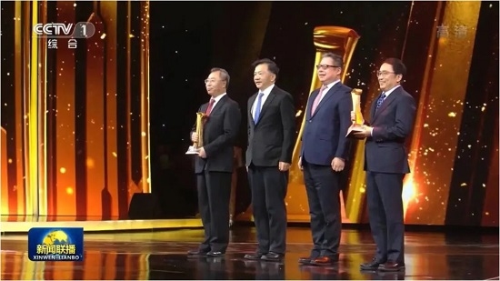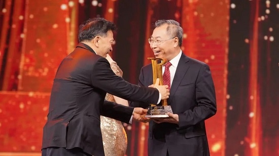 中宣部副部長、中央廣播電視總臺臺長兼總編輯慎海雄為國藥集團董事長劉敬楨頒獎。