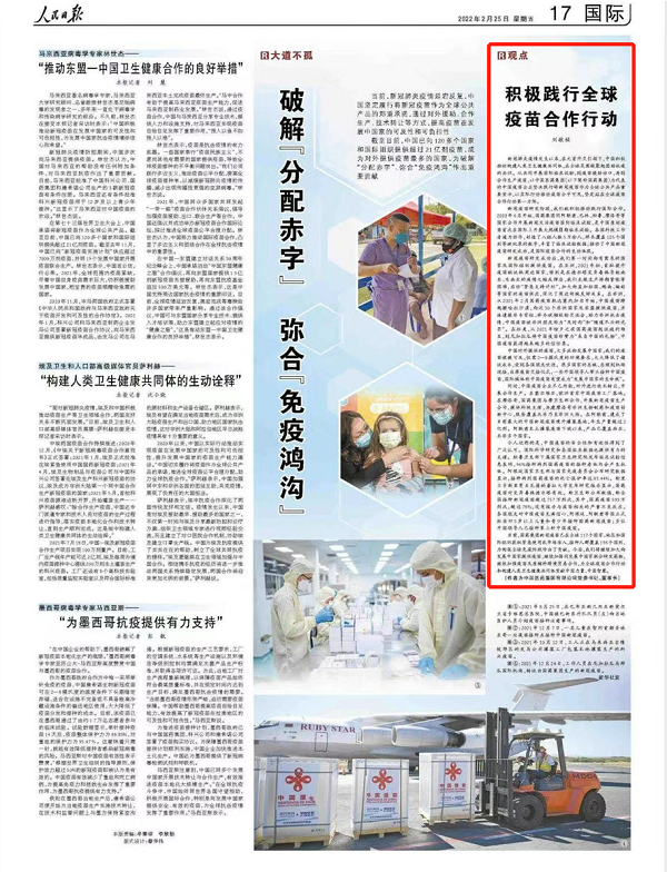 新冠疫苗研發階段,我們就積極推動踐行國際合作。2020年6月開始,國藥集團同阿聯酋、巴林、秘魯、摩洛哥等國家合作開展新冠滅活疫苗國際臨床試驗,是中國原創疫苗首次在國際上開展大規模Ⅲ期臨床試驗。各國科技工作者通力協作,創造了入組人數5萬余人,樣本覆蓋125個國別等破紀錄的數字,豐富了臨床試驗數據,推動了中國新冠疫苗研發成功,是國際疫苗合作的生動體現。