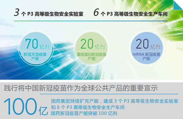 新冠滅活疫苗、重組蛋白新冠疫苗、mRNA新冠疫苗合計整體年產能超過100億劑,成為全球最大疫苗研發生產基地和供應商,截至2022年1月已累計向全球生產供應新冠疫苗35億劑。