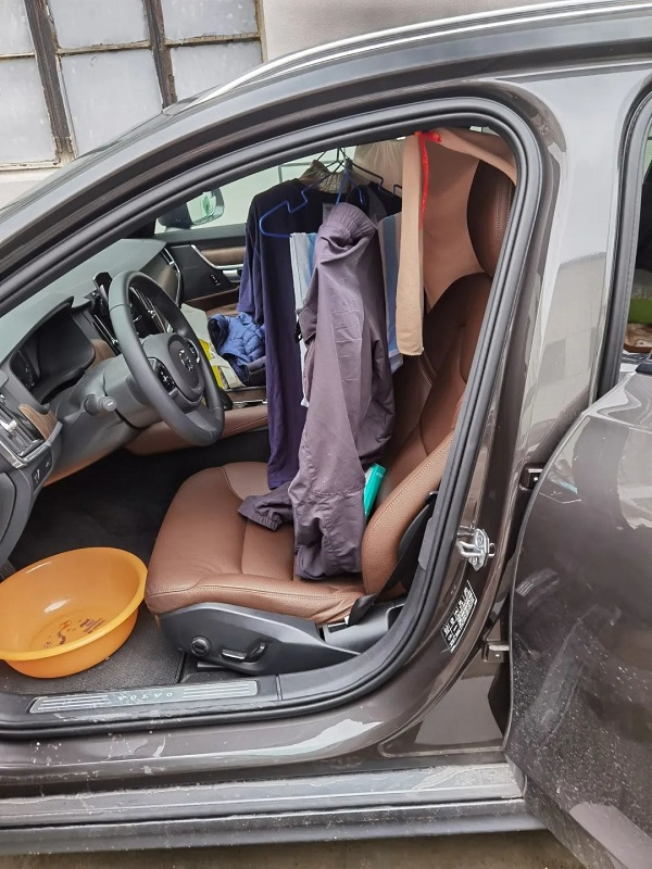 打開(kāi)車(chē)門(mén),放平后座,蓋張?zhí)鹤樱@便是“床”。再往駕駛座位下塞個(gè)盆、上面掛幾件衣服,這便是“陽(yáng)臺(tái)”。