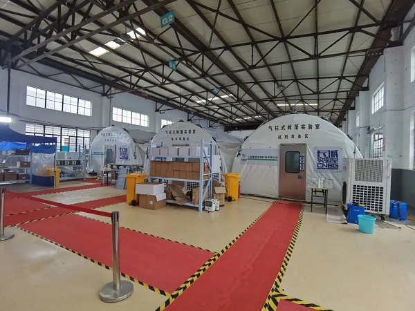 3月15日,幾輛14米長(zhǎng)的大卡車(chē)滿(mǎn)載氣膜艙體、核酸提取儀等設(shè)備,駛進(jìn)松江區(qū)九亭鎮(zhèn)伴亭東路的一處廠房。大家擼起袖子、當(dāng)起工人,硬是在這個(gè)“毛坯房”里建起一座生物安全標(biāo)準(zhǔn)不輸傳統(tǒng)實(shí)驗(yàn)室的氣膜實(shí)驗(yàn)室。