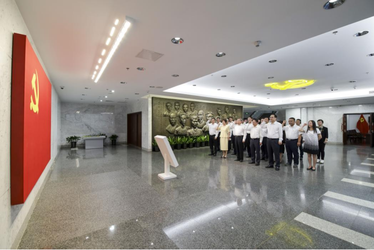 來到宣誓大廳,面對莊嚴鮮紅的黨旗,站立在毛澤東等建黨元勛浮雕旁,劉敬楨帶領(lǐng)黨員干部重溫入黨誓詞,“我志愿加入中國共產(chǎn)黨”的忠誠誓言在廳內(nèi)鏗鏘回響。