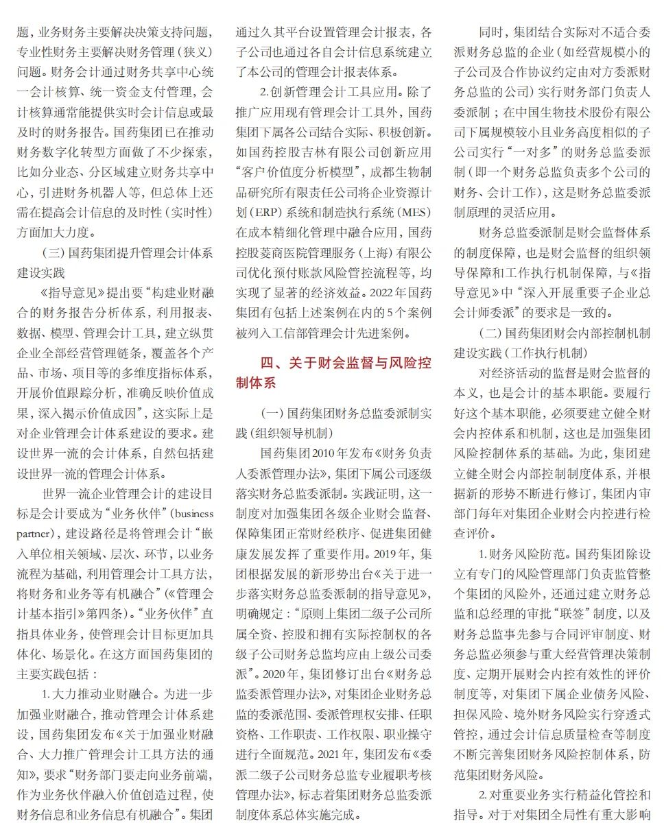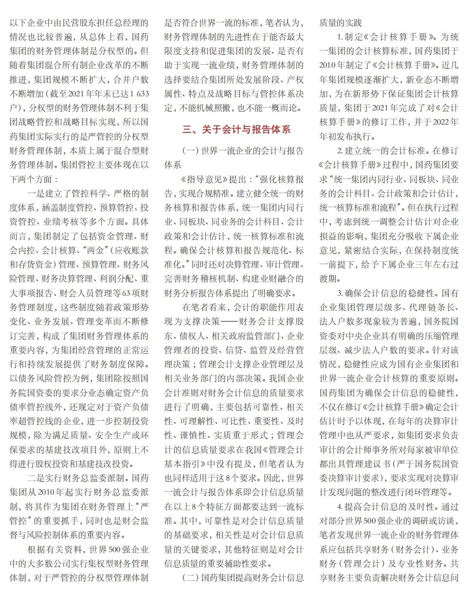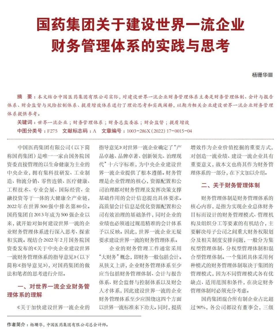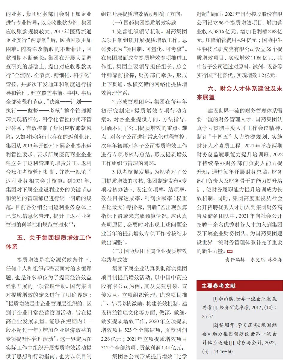 2022年2月,國務院國資委發布《關于中央企業加快建設世界一流財務管理體系的指導意見》,為中央企業進一步提升財務管理水平提供了具體指引和行動指南。中國醫藥集團有限公司(以下簡稱國藥集團)以建設 世界一流企業為目標,緊密結合集團管控和業務實際,構建并不斷優化財務管理體制、會計與報告體系、財會監督與風險控制體系,創新并持續完善獨具特色的提質增效工作體系,取得了積極的成效。集團從“大財務”概念出發,結合自身實際,對如何建設世界一流財務管理體系進行理論思考與實踐闡釋;搭建并完善與集團相匹配的會計核算體系、會計制度管理體系、管理會計體系、會計信息質量整改體系和會計信息質量監督評價體系,不斷完善會計體系建設;針對集團應收賬款占比大的特點,以“全流程、全節點、精細化、科學化”管控為核心原則,從“事前、事中、事后”全方位管控應收賬款,通過完善資信一體化平臺建設、建立客戶價值度分析模型、設置應收賬款專職管理機構及提升信息化管控手段等方式不斷提高應收賬款精細化管理水平;秉持“財務創造價值”理念,不斷強化業財融合,創新管理會計工具應用,在進一步實現醫藥返利精準、高效核算的同時,細化返利管理顆粒度,加速返利回收;通過財務總監委派制不斷強化對下屬企業的財會監督,加強財務管理,有效防范企業經營風險和財務風險;在對提質增效的理論依據和邏輯進行認真分析的基礎上,持續推動并完善提質增效項目制,以黨建引領作保障、以目標激勵促落實 , 確保提質增效做實做細取得實效。國藥集團開展的一系列務實、創新的財務管理體系建設實踐對助力集團高質量發展和創建世界一流企業發揮了重要作用, 希望能為相關企業集團加強財務管控和建設財務管理體系提供參考和借鑒。