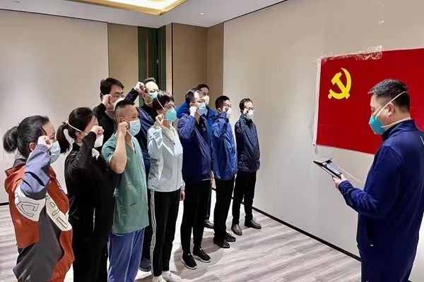 2022年4月15日晚上,國藥集團援滬醫療先鋒隊臨時黨支部召開第一次會議,臨時黨支部書記程立帶領全體黨員和預備黨員重溫入黨誓詞。面對黨旗,援滬隊員感到由衷的神圣和莊嚴,誓與疫情戰斗到底,決心把疫情防控作為使命和責任,以行動踐行入黨初心,筑牢保護人民群眾生命安全的鋼鐵長城。