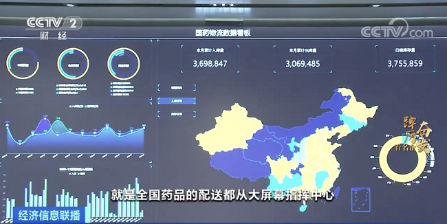 中國醫藥集團有限公司黨委書記 董事長 劉敬楨:這是整個國藥物流數據的一個智慧控制指揮中心,全國藥品的配送都從大屏幕指揮中心來進行統一的指揮調度配送,從去年(2022年)12月份開始到目前,我們累計供應了各類醫用物資、藥品,包括防疫物資,現在達到了6.9億件。
